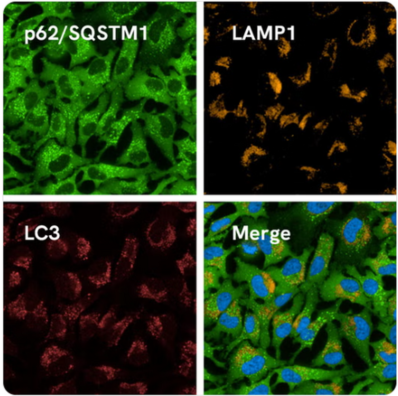 The PhenoVue autophagy staining kit provides a powerful and user-friendly solution for high-content imaging of key autophagy markers in fixed cells. It includes characterized, specific antibodies against: