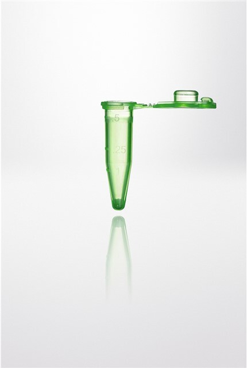 Safelock-Cap microcentrifuge tube PP, 0,5ml, attached cap, boil-proof, green, grad., writ. area np pcr ready, max. RCF 30.000g, autocl. up to 121°C